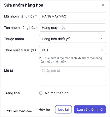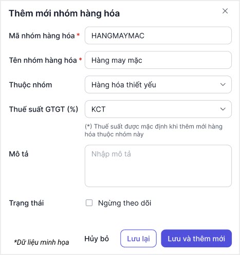 • Chọn Thuộc nhóm nếu nhóm hàng hóa đang khai báo là nhóm con của 1 nhóm hàng hóa khác.