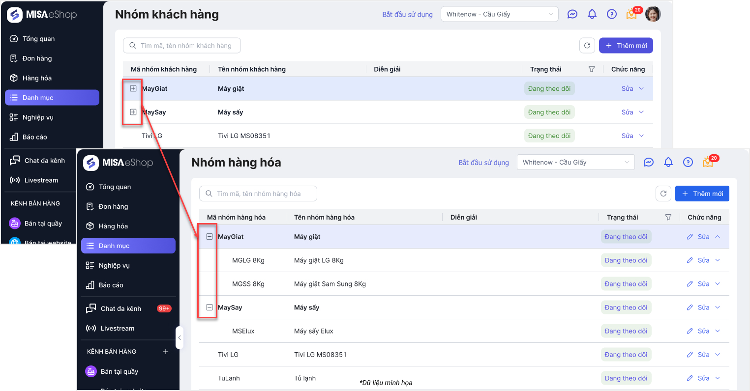 Nhấn vào biểu tượng mở rộng hoặc thu gọn  để xem đầy đủ nhóm hàng hóa hoặc chỉ xem các nhóm hàng hóa cha.