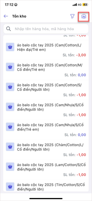 Tại màn hình danh sách tồn kho, nhấn vào biểu tượng
