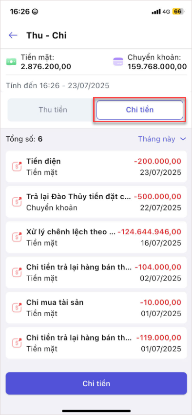 Chọn tab Chi tiền để xem danh sách các phiếu chi.