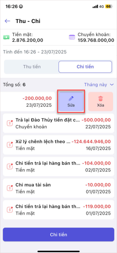 Gạt từ phải sang trái trên dòng phiếu chi cần sửa và nhấn Sửa.