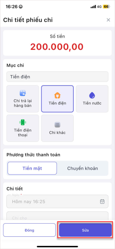 Hoặc tích vào phiếu chi cần sửa để mở chi tiết. Sau đó, nhấn vào nút Sửa.