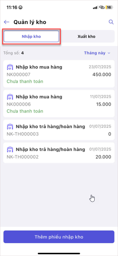 Chọn tab Nhập kho để xem danh sách các phiếu nhập kho.