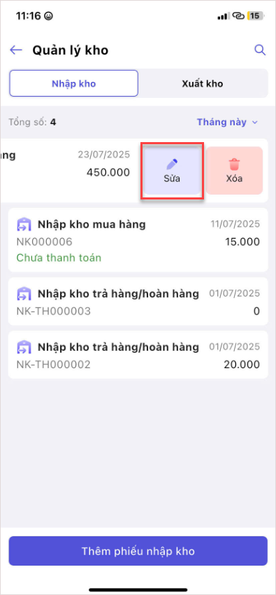 Gạt sang trái trên dòng phiếu nhập cần sửa và nhấn Sửa.