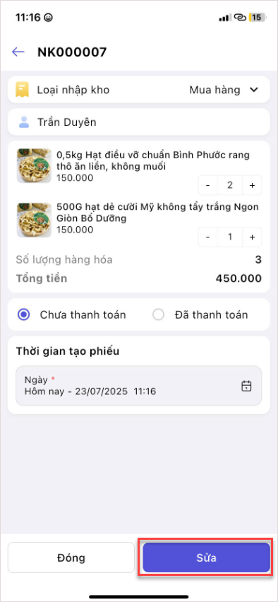 Hoặc nhấp chuột vào phiếu nhập kho cần sửa để mở chi tiết. Sau đó, nhấn vào nút Sửa.