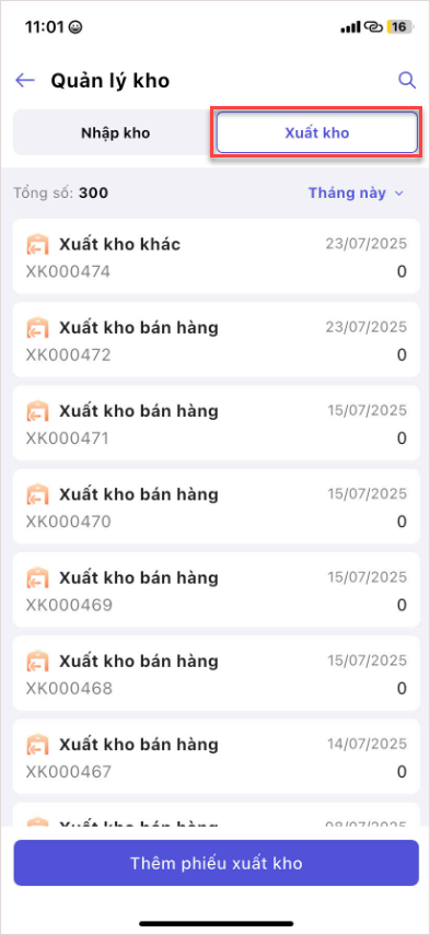 Chọn tab Xuất kho để xem danh sách các phiếu xuất kho.