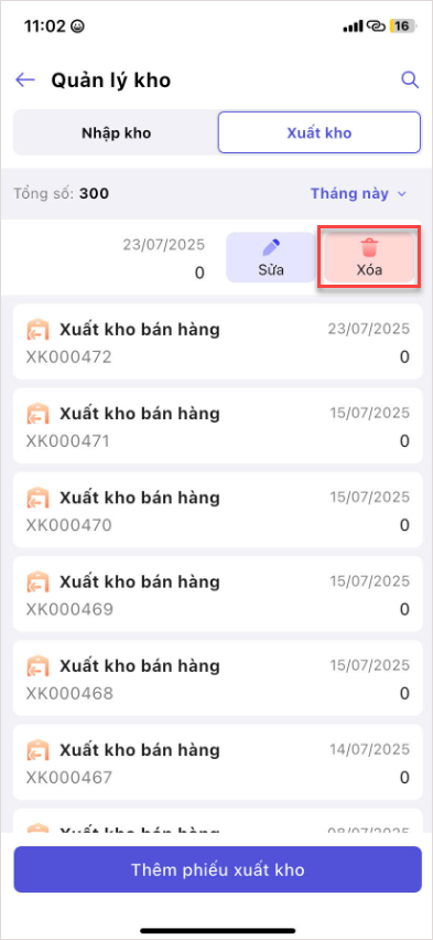 4. Xóa phiếu xuất kho trên điện thoại