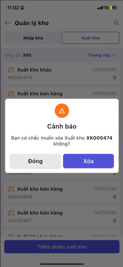 Nhấn Xóa để hoàn tất việc xóa phiếu xuất kho.