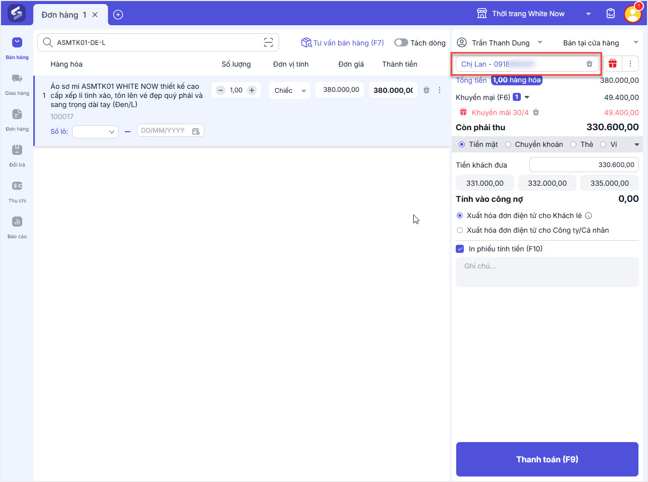 Nhấn Thanh toán để ghi nợ số tiền này cho khách hàng.