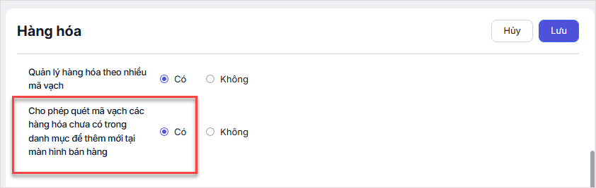 Nhấn và tích chọn tại dòng Cho phép quét mã vạch các hàng hóa chưa có trong danh mục để thêm mới tại màn hình bán hàng.