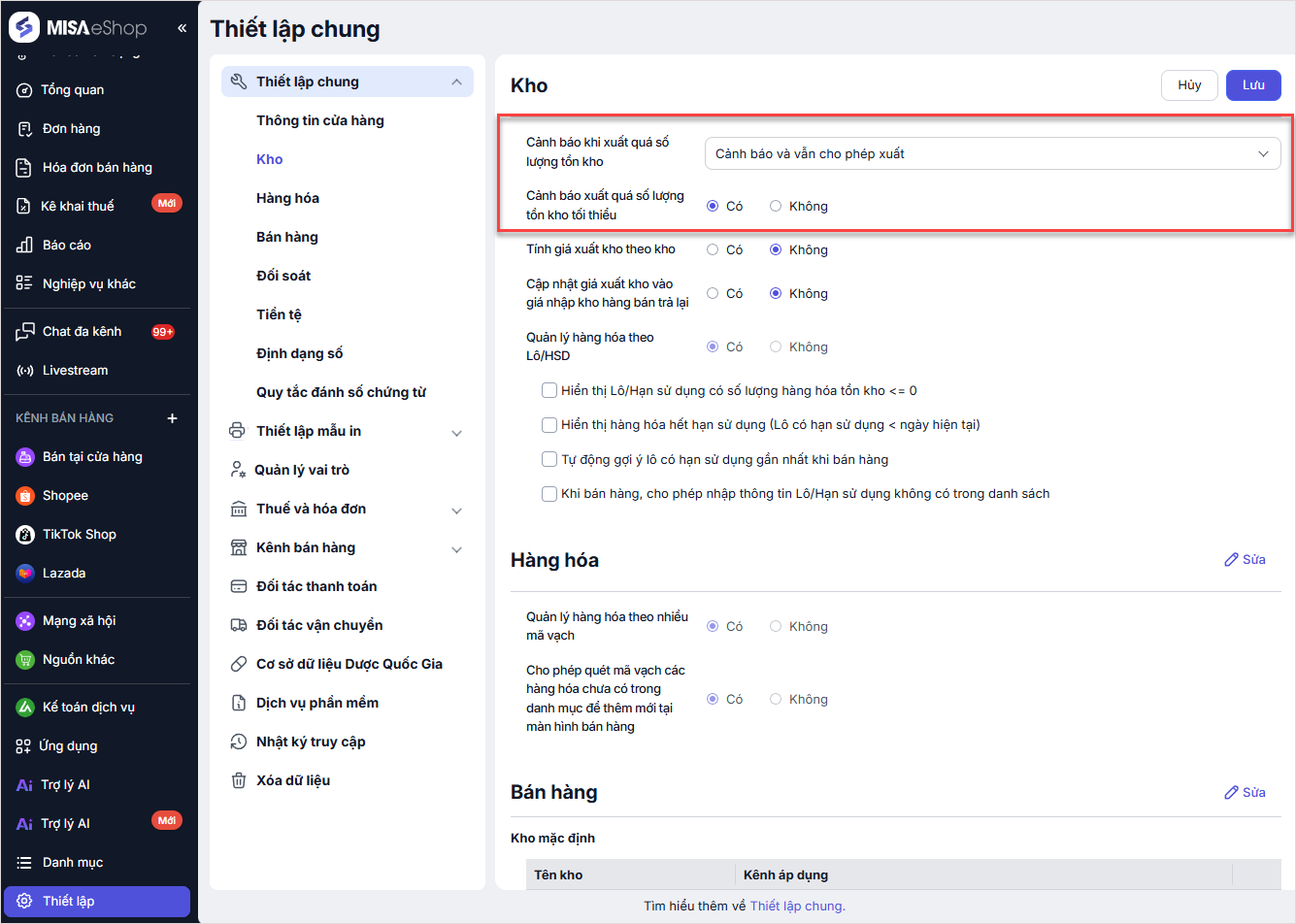 Bước 1. Truy cập mục Thiết lập chung/Hàng hóa