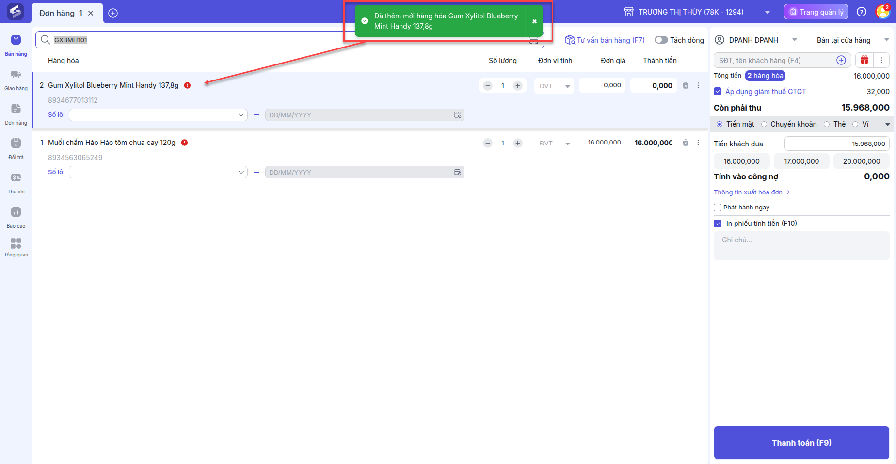 Sau khi thiết lập thành công, khi quét mã sản phẩm mới (chưa có trong danh mục), hệ thống sẽ tự động thêm sản phẩm vào đơn hàng và hiển thị thông báo “Đã thêm mới hàng hóa”. Đồng thời cập nhật sản phẩm vào danh mục hàng hóa.