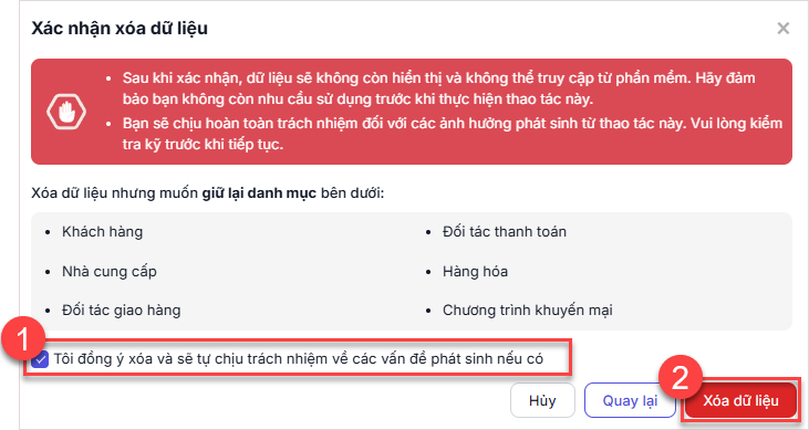 Nội dung bao gồm các bước thực hiện xóa dữ liệu, xác nhận thao tác và lựa chọn giữ lại danh mục cần thiết.