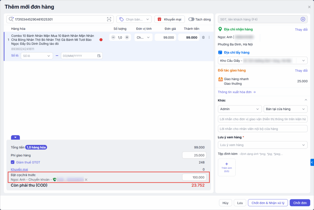 Bước 7: Trường hợp khách hàng đã đặt cọc trước tiền đơn hàng