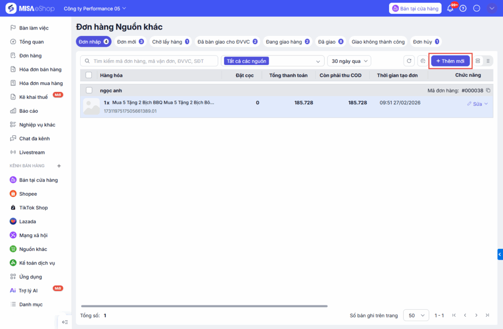 Bước 2: Hệ thống sẽ chuyển sang màn Danh sách đơn nguồn khác, chọn Thêm mới.