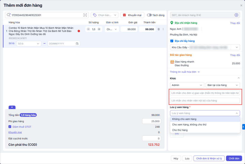 - Nhập Ghi chú cho đơn vị vận chuyển hoặc nhân viên nội bộ (nếu có).