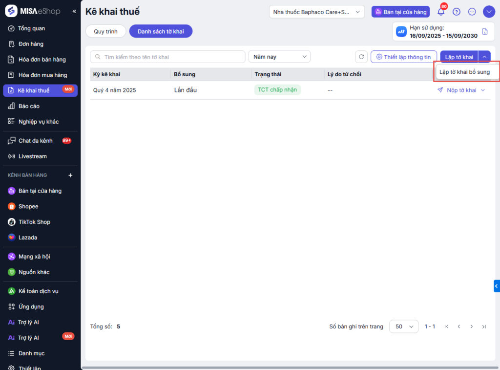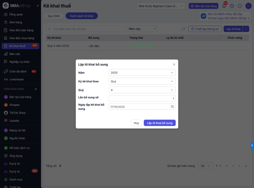 - Tờ khai bổ sung sẽ tự động tính toán ra chênh lệch giữa lần khai bổ sung hiện tại và tờ khai liền trước đó. Nếu tờ khai trước đó không khai báo trên MISA eShop, hệ thống sẽ không thể tính toán tự động, bạn vui lòng tự kiểm tra lại và khai báo lại thông tin chính xác để đảm bảo hợp lệ trước khi gửi lên CQT.