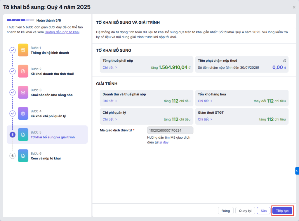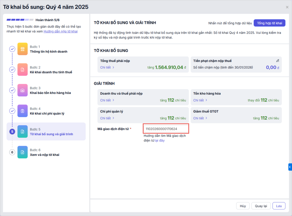 Quan trọng: Để hoàn tất tờ khai bổ sung, bạn cần khai báo mã giao dịch điện tử của tờ khai trước đó vào tờ khai bổ sung làm căn cứ để Cơ quan thuế kiểm tra và đối chiếu. Chi tiết cách lấy mã giao dịch điện tử tại đây.