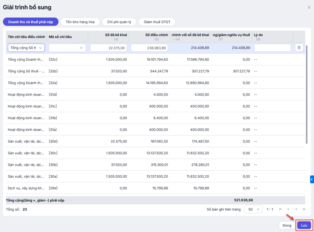 Sau khi hệ thống tự động tính toán, có thể bấm vào Chi tiết để kiểm tra các nội dung giải trình chi tiết mà hệ thống đã tự động tính toán.