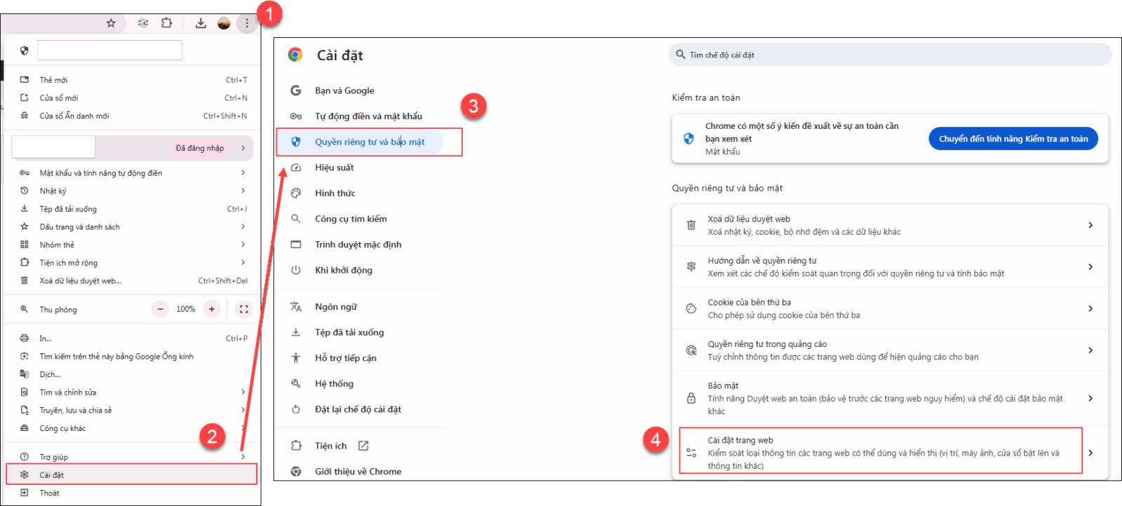 - Nhấn vào biểu tượng ba chấm (⋮) ở góc trên bên phải và chọn Cài đặt (Settings). Chọn Quyền riêng tư và bảo mật (Privacy and security).