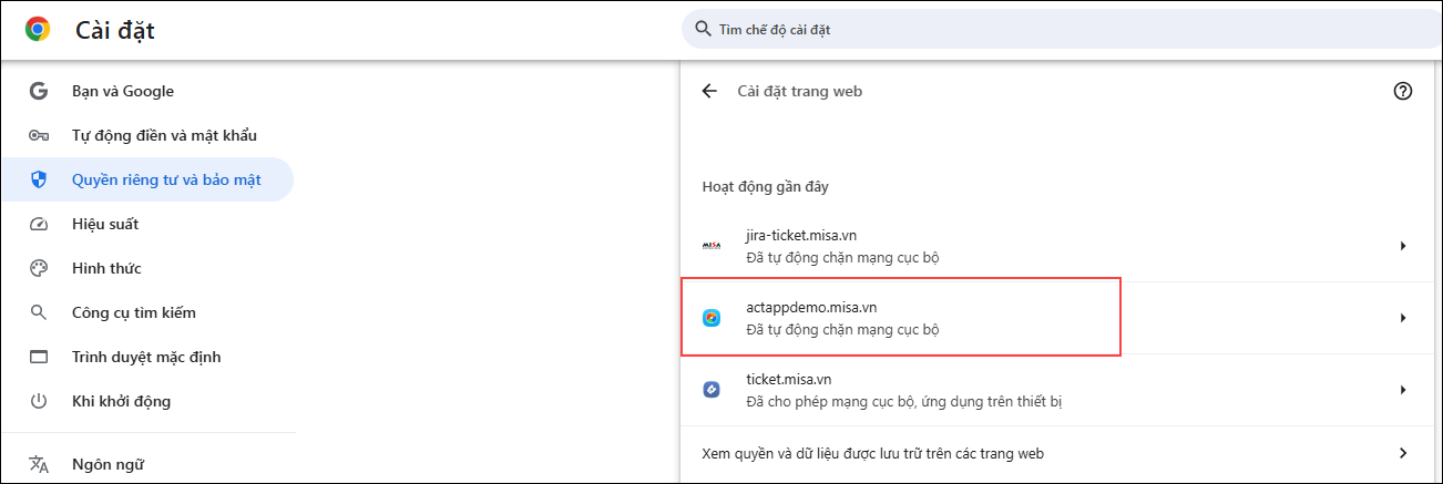 - Nhấn vào Cài đặt trang web (Site settings), trong mục Hoạt động gần đây (Recent activity), chọn trang web actapp.misa.vn