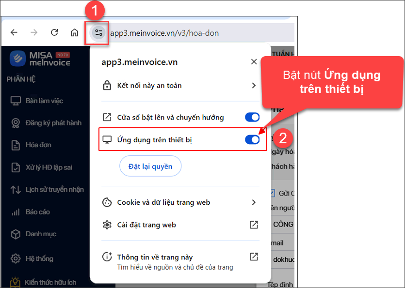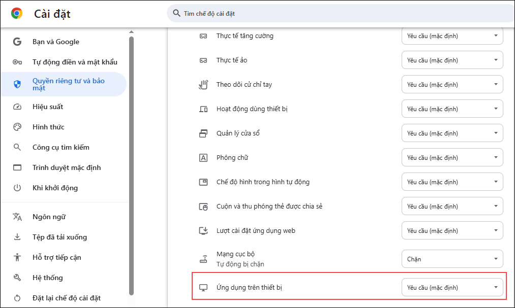 - Tại danh sách các quyền của trang web, tìm mục Ứng dụng trên thiết bị