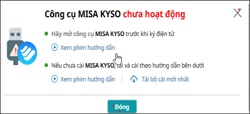 Khi ký điện tử, chương trình hiển thị cảnh báo Công cụ MISA KYSO chưa hoạt động: