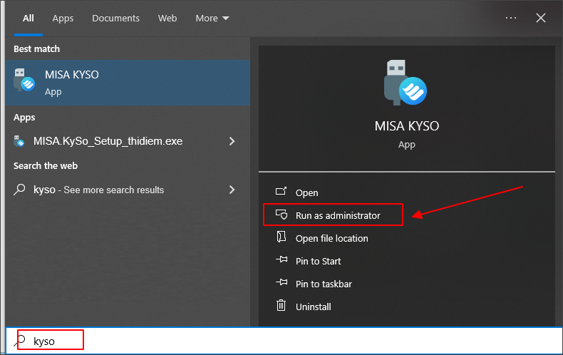 Giải pháp: Nhấn Tải bộ cài trên cảnh báo và thực hiện cài đặt. Sau khi cài đặt nhấn biểu tượng Windows > nhập KYSO > nhấn Run as Administrator