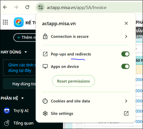 - Trong danh sách các quyền của trang web, tìm đến mục Ứng dụng trên thiết bị (Apps on device).Thiết lập quyền: Chọn Hỏi trước (mặc định) – Ask (default) hoặc Cho phép – Allow để cho phép trình duyệt truy cập ứng dụng MISA KYSO trên máy tính.