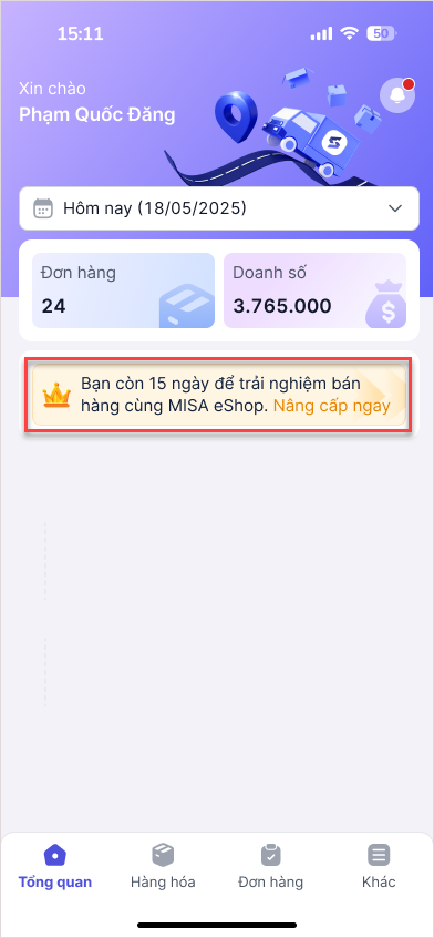 Tại màn hình Tổng quan, nhấn vào dòng Nâng cấp ngay trên nội dung thông báo.