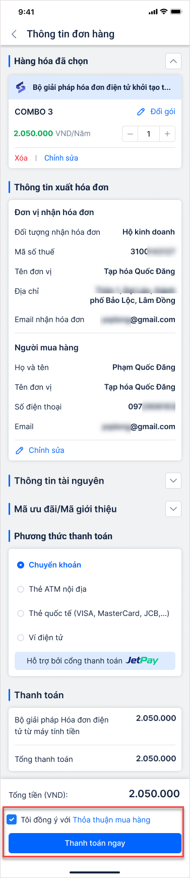 Tích chọn Tôi đồng ý với thỏa thuận mua hàng. Sau đó, nhấn Thanh toán ngay.