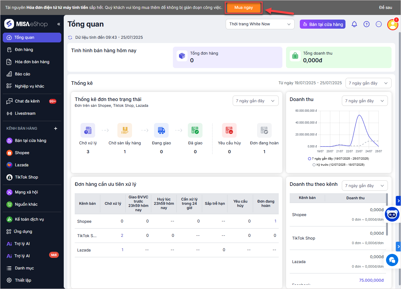 - Trường hợp sắp hết số hóa đơn, chương trình hiển thị cảnh báo nhắc nhở mua thêm, nhấn Mua thêm ngay trên câu cảnh báo
