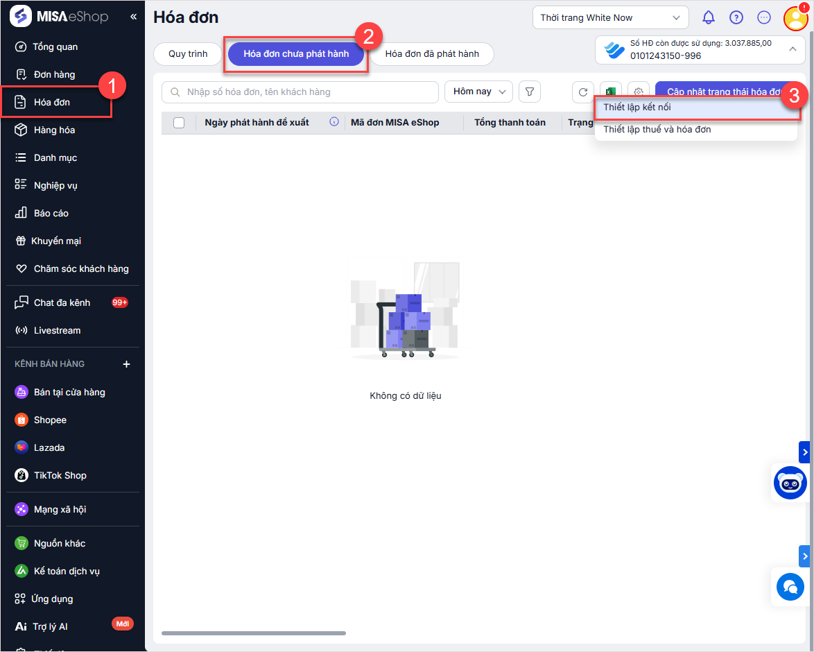 - Hoặc vào Hóa đơn/Hóa đơn chưa phát hành, nhấn chuột vào dòng Số HĐ còn được sử dụng và chọn Thiết lập kết nối