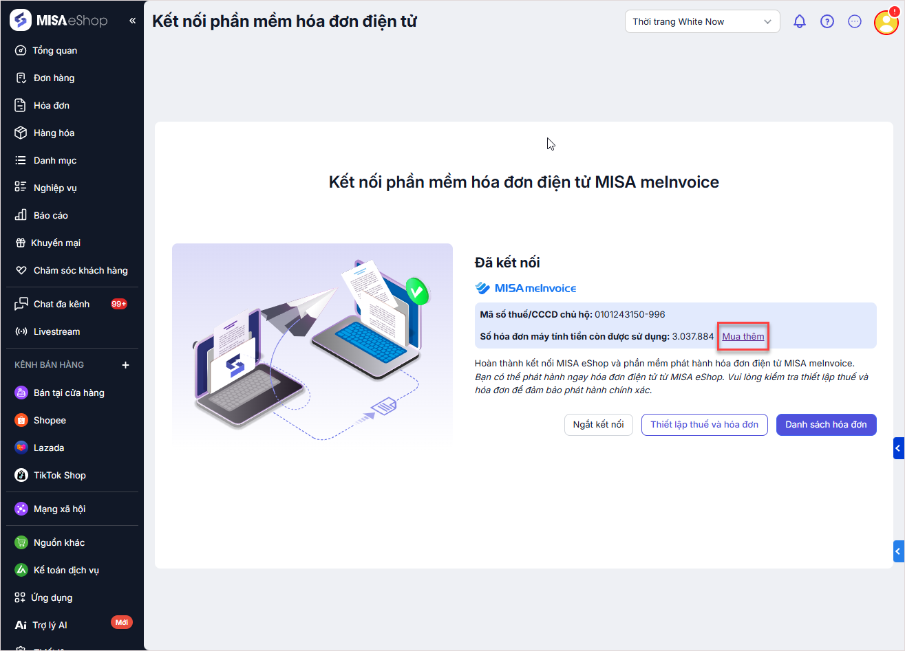 Để mua thêm hóa đơn meInvoice, thực hiện như sau:
