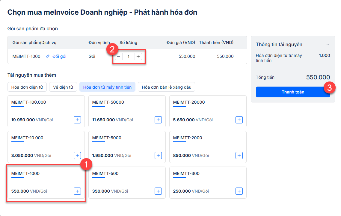 Chọn gói sản phẩm mua, sau đó nhấn Thanh toán.