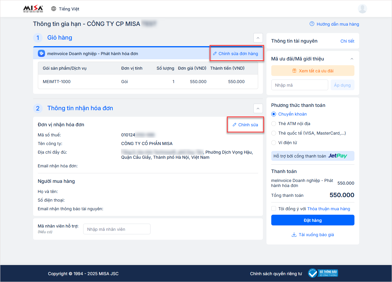 - Kiểm tra Thông tin gói sản phẩm/Dịch vụ và Thông tin nhận hóa đơn. Nếu cần thay đổi thông tin, nhấn Chỉnh sửa.