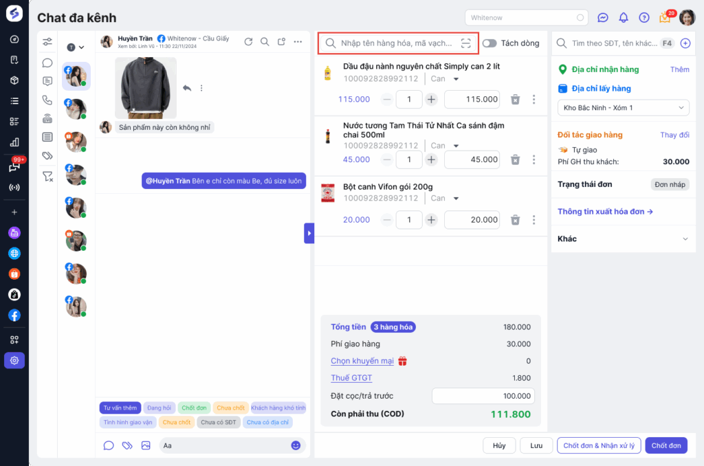 Hướng dẫn tạo đơn hàng nhanh chóng ngay sau khi khách hàng xác nhận mua trong đoạn hội thoại từ chat đa kênh, giúp người bán tiết kiệm thời gian thao tác, tránh sai sót trong quá trình ghi nhận thông tin, đồng thời hỗ trợ quản lý đơn hàng tập trung và hiệu quả hơn ngay trên phần mềm.