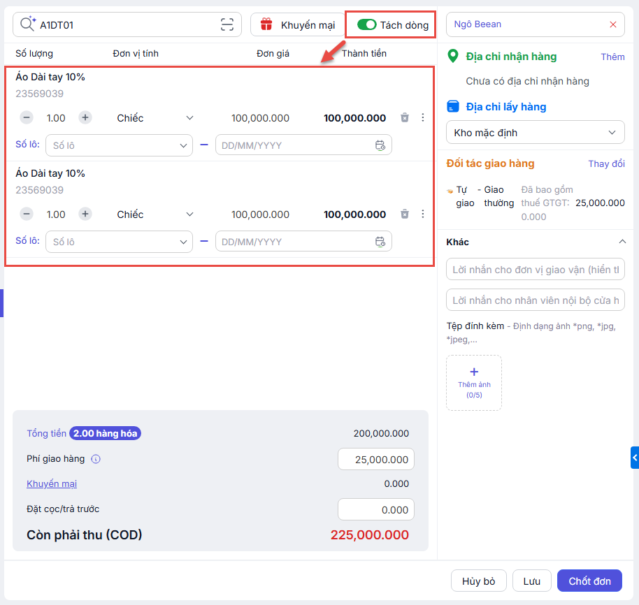 - Để tách dòng các hàng hóa có số lượng >1, nhấn mở tính năng tách dòng, hệ thống sẽ tách nhỏ thành từng dòng hàng hóa riêng biệt.