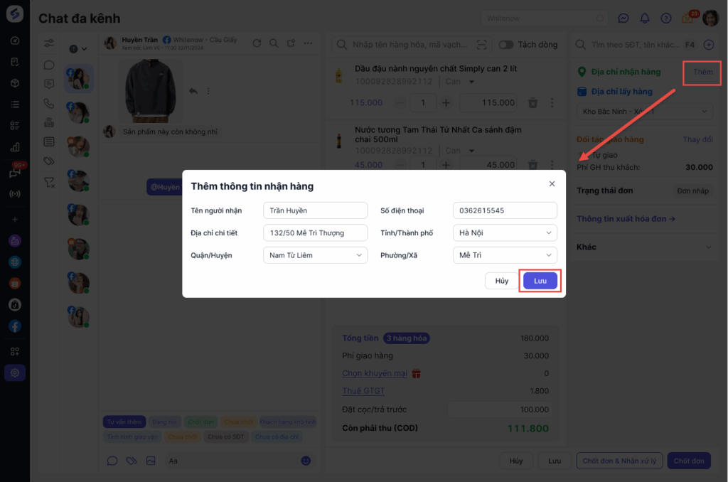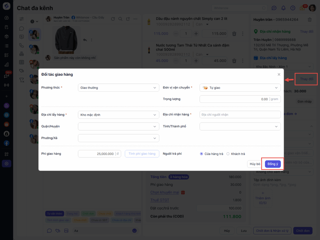 – Nếu chưa có, hệ thống tự động lấy lên tên khách hàng → Nhấn Thêm để thêm địa chỉ nhận hàng → Nhập các thông tin địa chỉ nhận hàng đã xác nhận với khách → Nhấn Đồng ý.