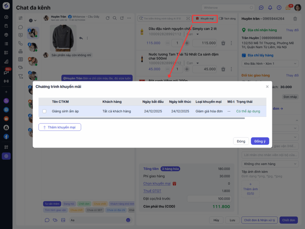 - Để thêm khuyến mại, chọn Khuyến mại → Chọn chương trình khuyến mại phù hợp → Nhấn Đồng ý.