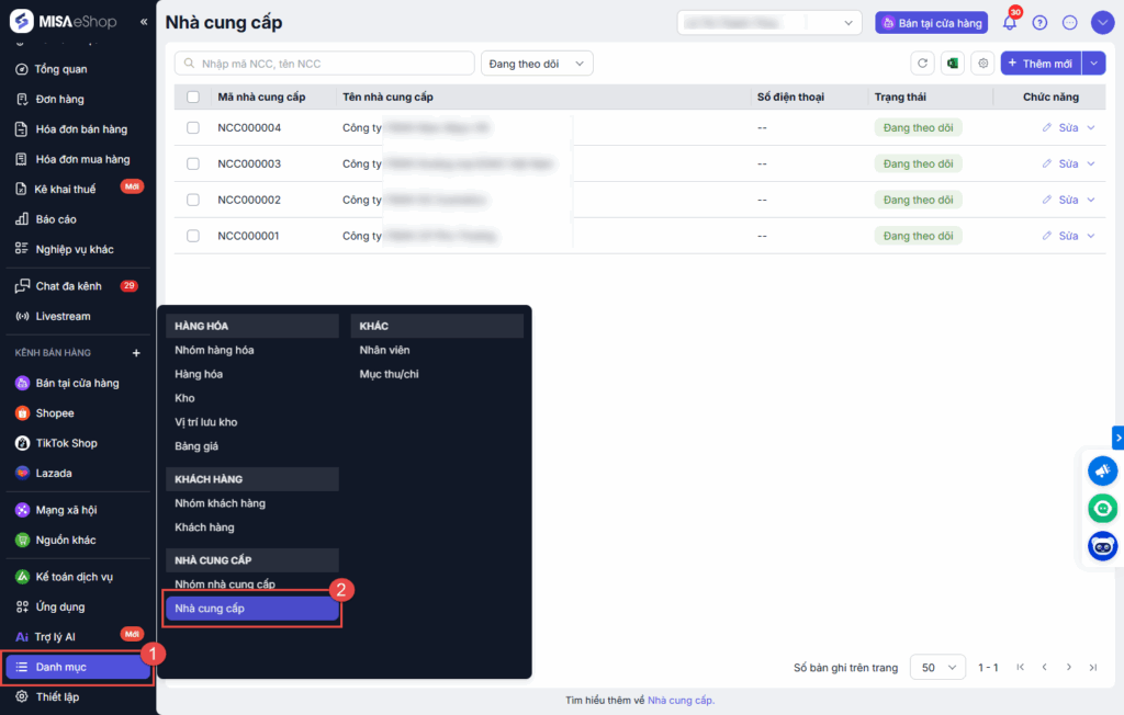 Bước 1: Tại màn hình tổng quan, chọn Danh mục/Nhà cung cấp