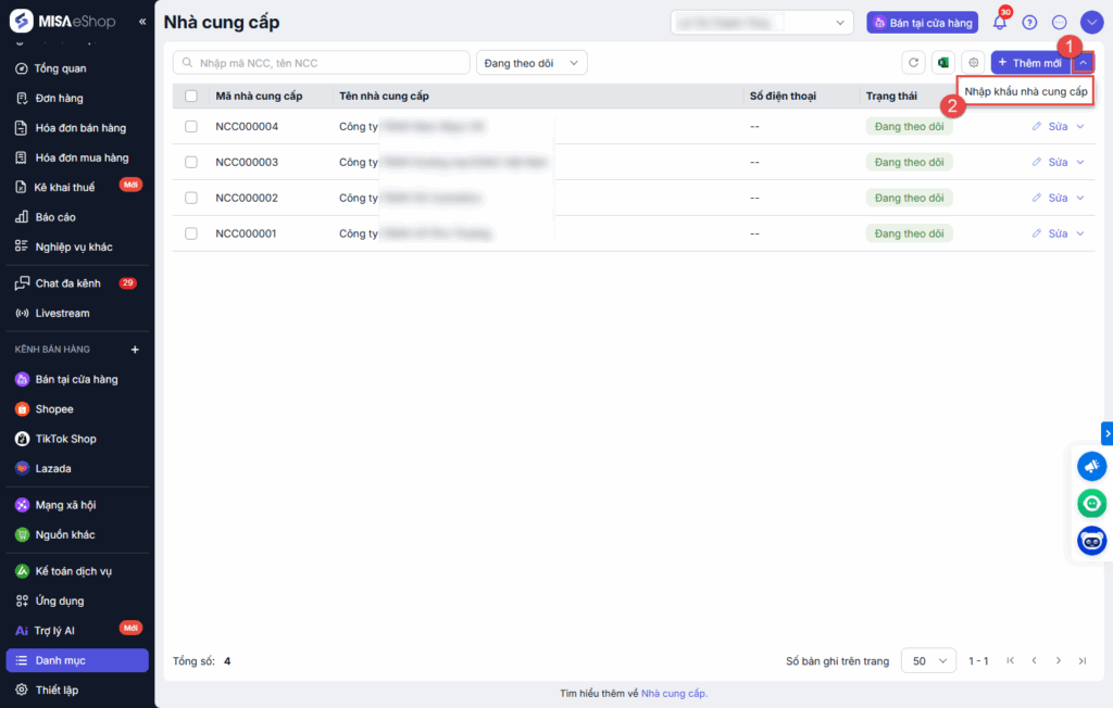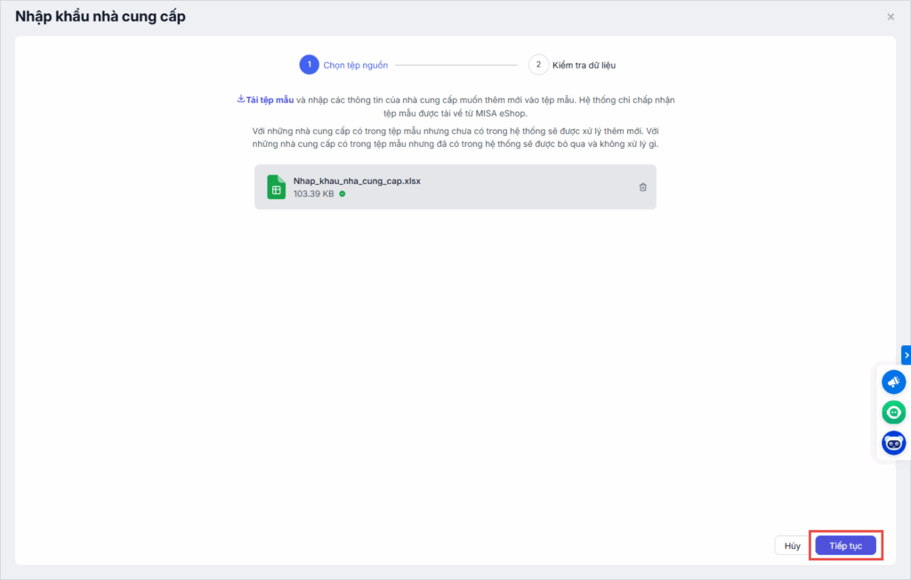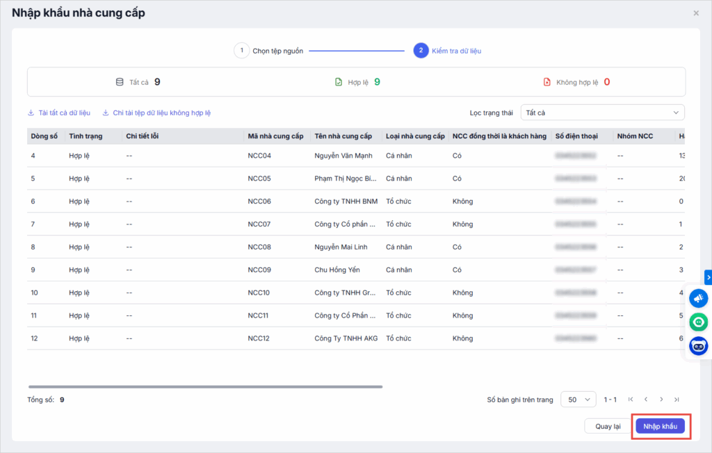 - Sau khi kiểm tra hoàn tất, nhấn Nhập khẩu để chính thức đưa các dữ liệu hợp lệ vào danh sách nhà cung cấp trên hệ thống.