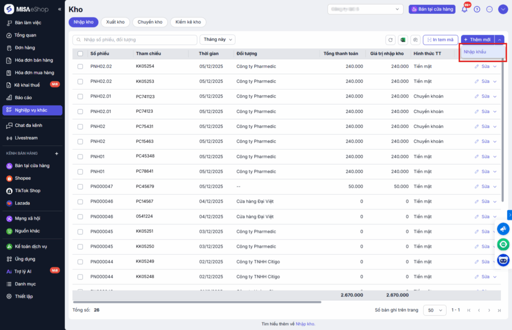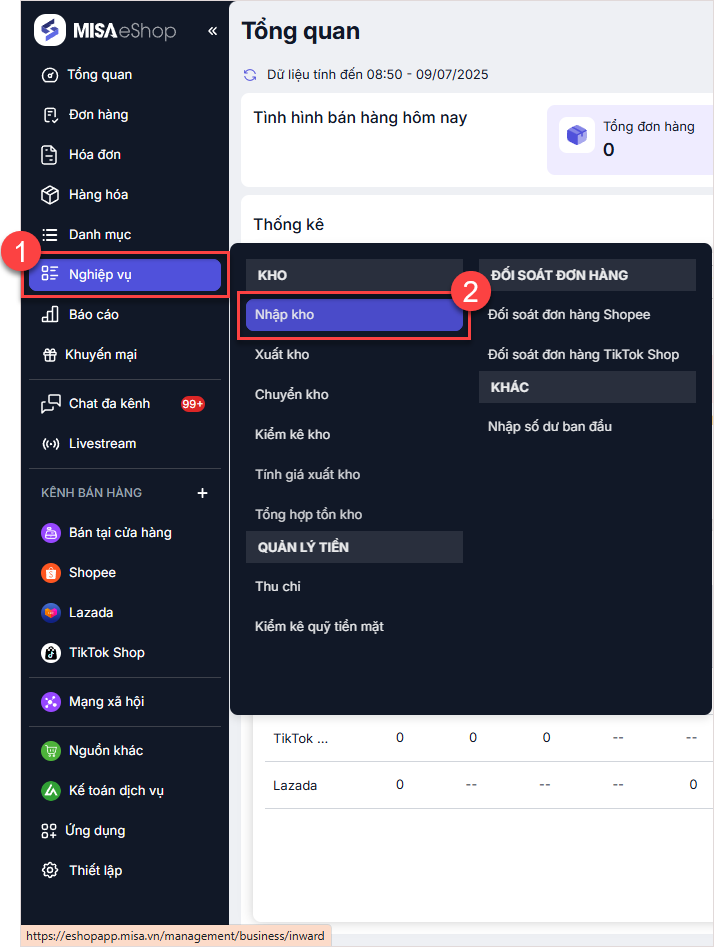 Bước 1: Truy cập chức năng nhập kho