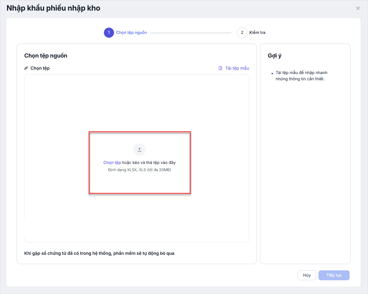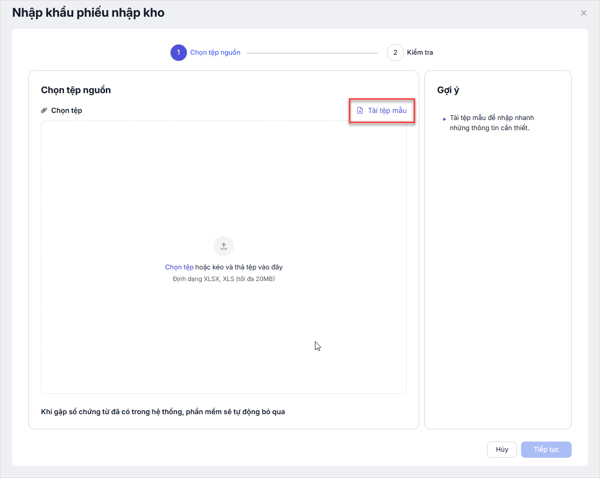 Nhấn Tải tệp mẫu và điền thông tin phiếu nhập kho cần nhập khẩu vào file excel mẫu