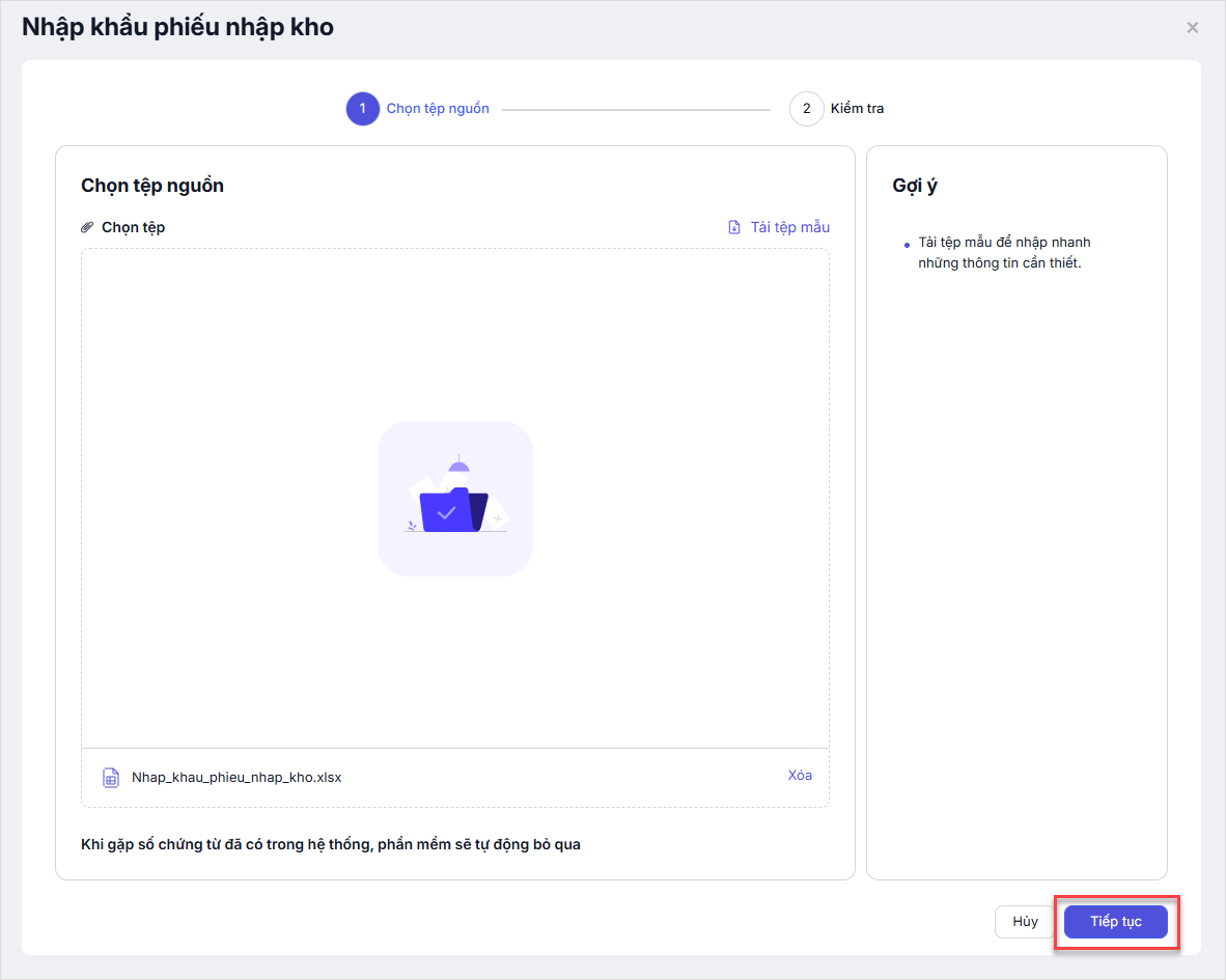 Nhấn Chọn tệp để tải lên file excel vừa thiết lập. Sau đó, nhấn Tiếp tục.