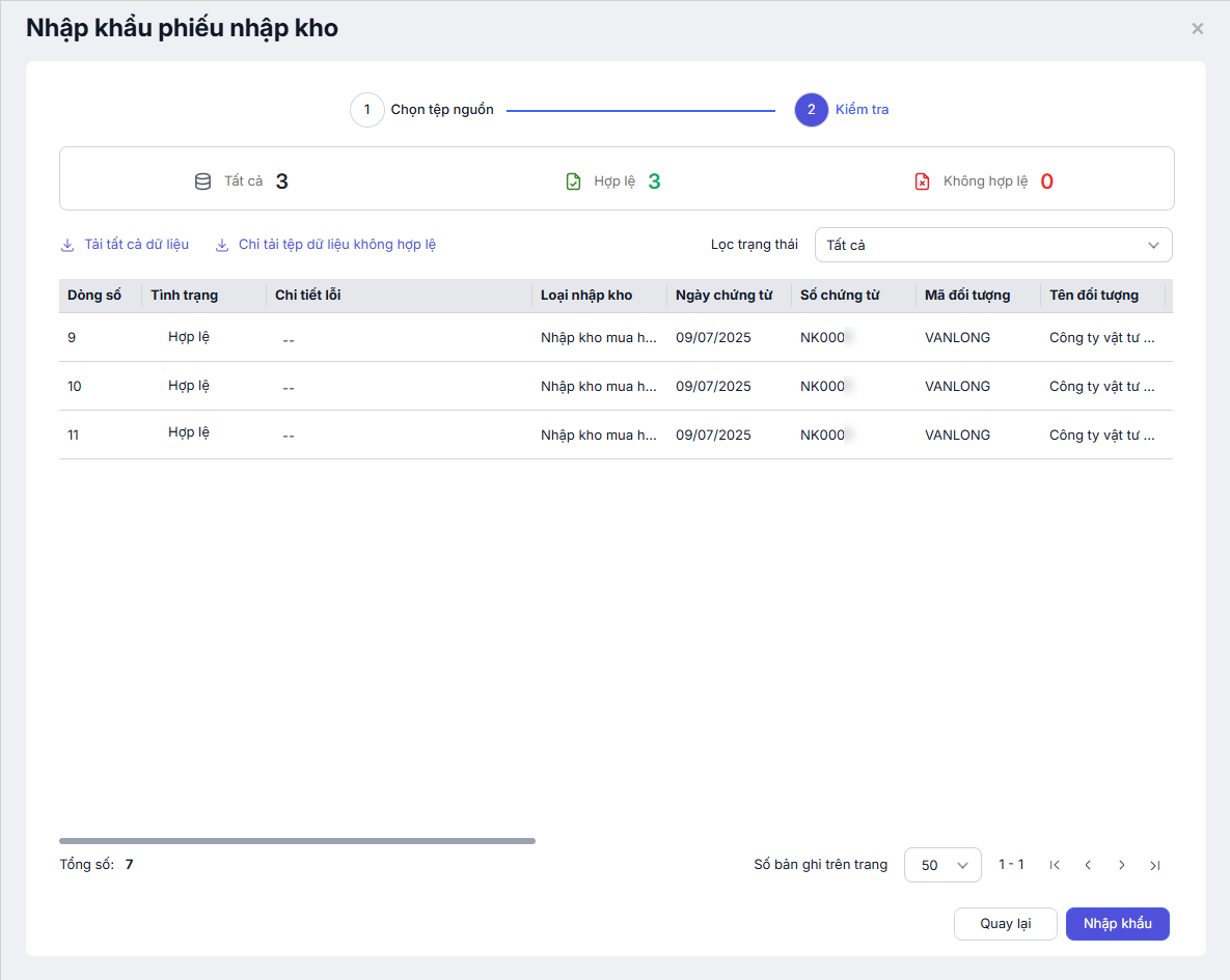 - Chỉ các dòng hợp lệ mới được nhập khẩu thành công vào hệ thống.