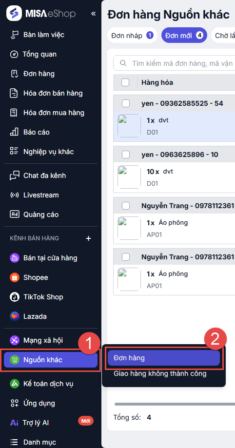 Bước 1: Tại màn hình tổng quan, chọn Nguồn khác > Đơn hàng.