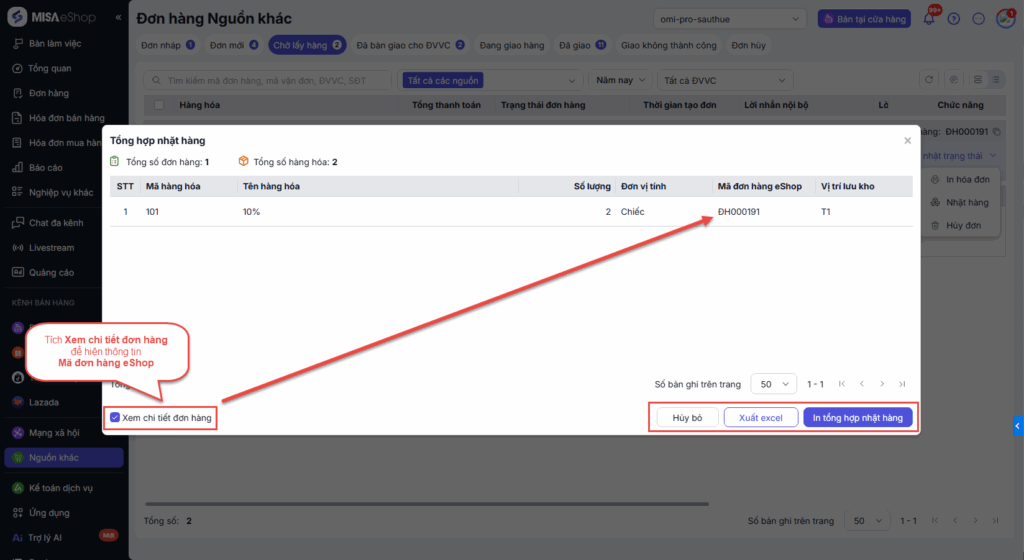 - Tích chọn “Xem chi tiết đơn hàng” để kiểm tra cụ thể từng mặt hàng thuộc đơn nào.