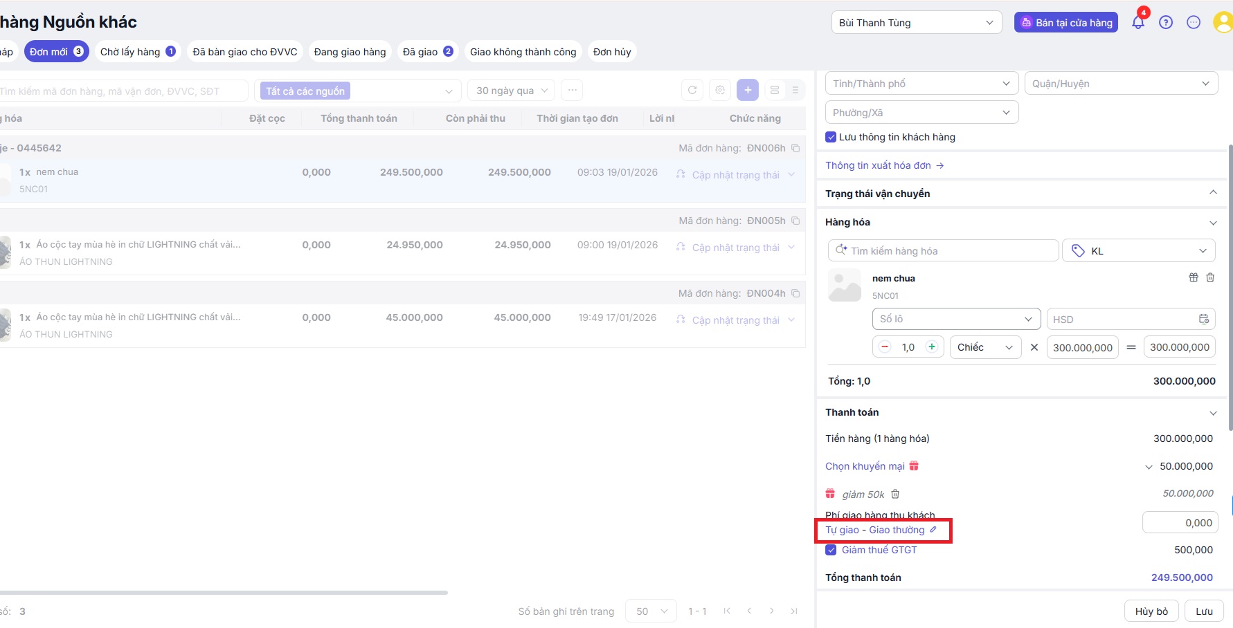 Anh/chị thực hiện sửa đơn hàng → Tích dòng Tự giao – giao thường → Nhập Địa chỉ lấy hàng (Kho mặc định bán hàng) → Lưu.