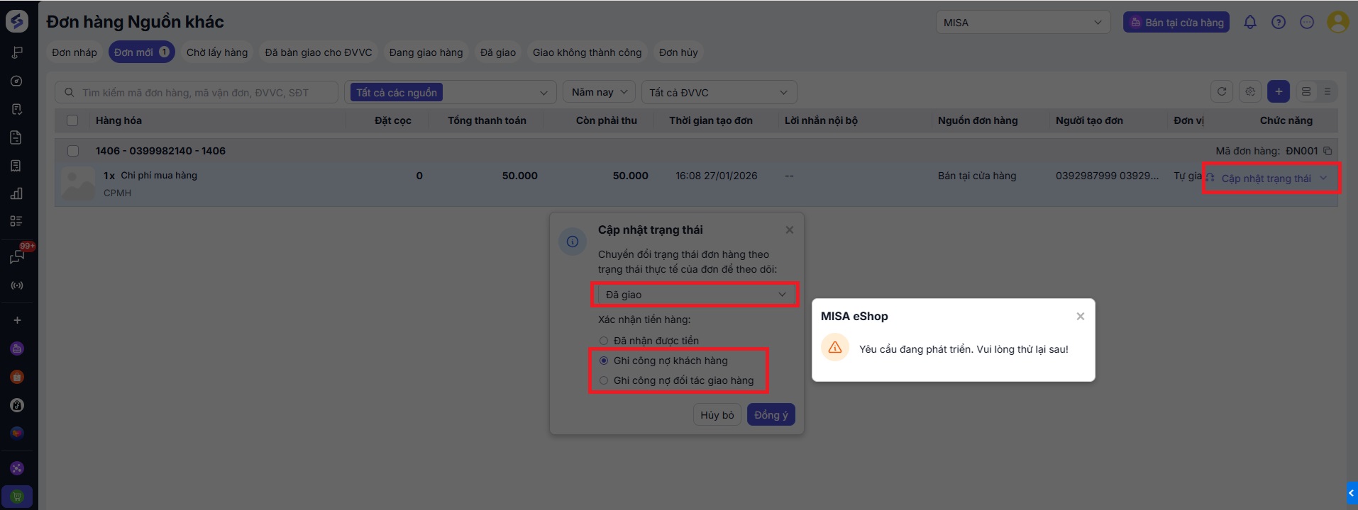 Hiện phần mềm đang đáp ứng trạng thái: Đã nhận được tiền. Các hình thức khác phần mềm chưa đáp ứng: Ghi công nợ khách hàng hoặc Ghi công nợ đối tác giao hàng – Yêu cầu đang phát triển.